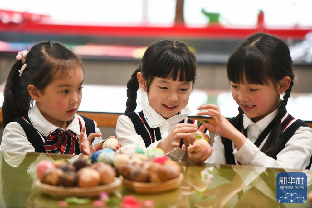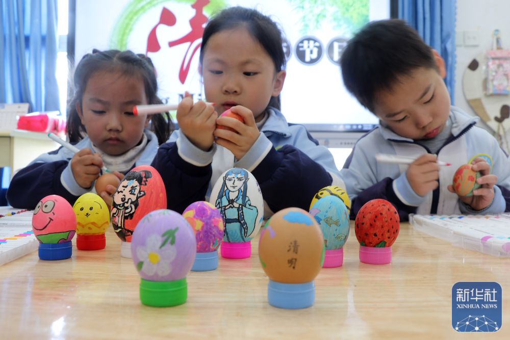 ↑ 4月3日,在浙江省金華市婺城小學,小學生在制作清明花草蛋。新華社發(時寬兵攝)