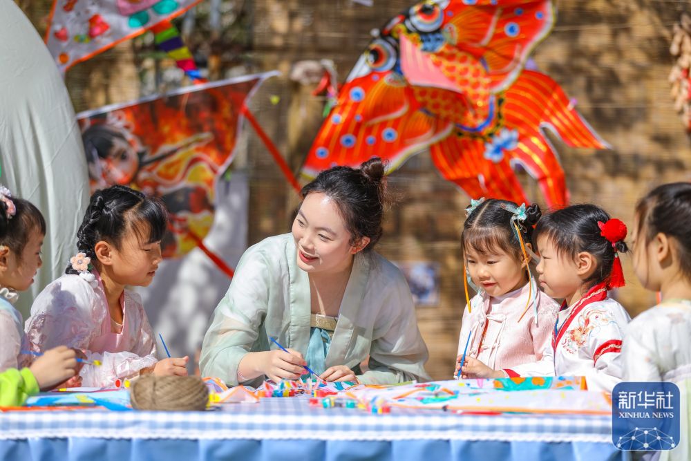 ↑ 4月2日,在山東省青島市李滄區青峰路幼兒園開展的迎清明活動中,老師指導小朋友繪制紙鳶。新華社發(張鷹攝)