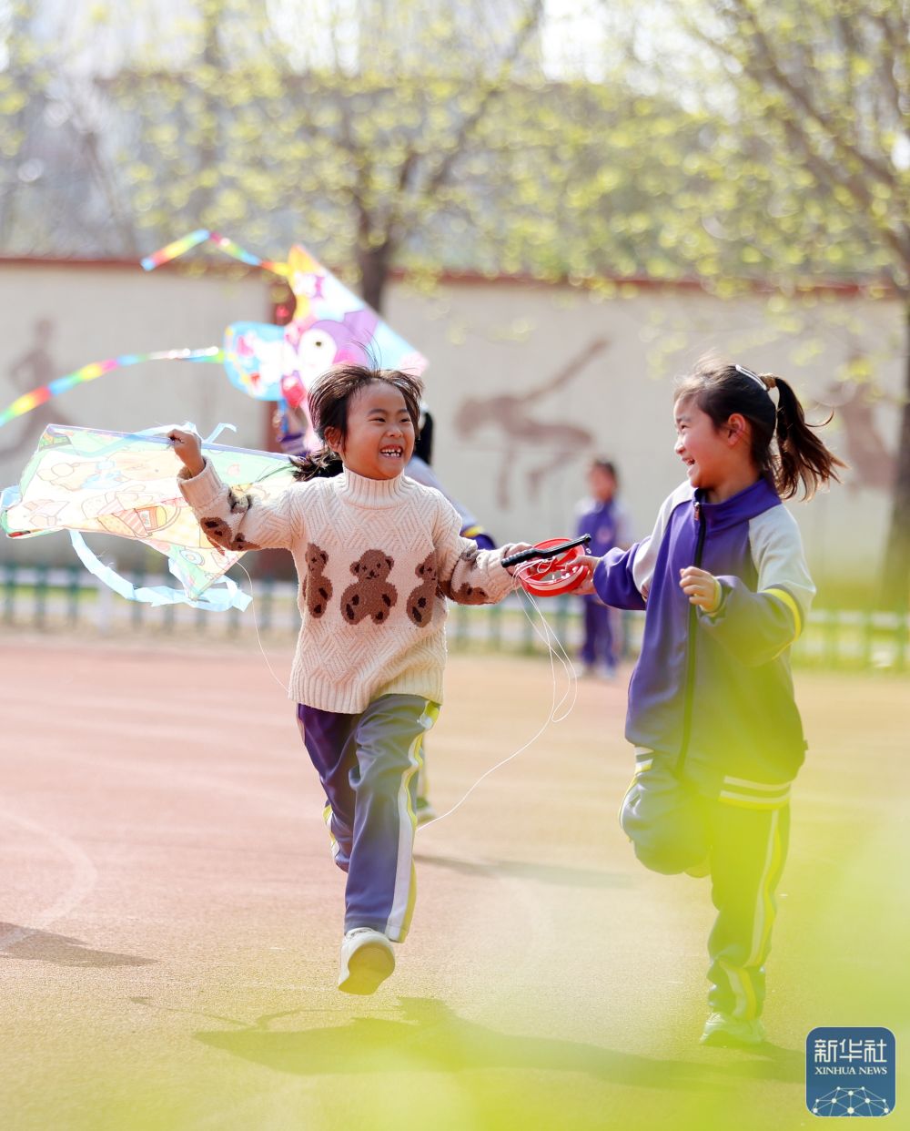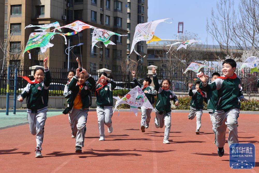 ↑ 4月3日,山東省臨沂市郯城縣第一實驗小學學生在操場上放風箏。新華社發(張春雷攝)