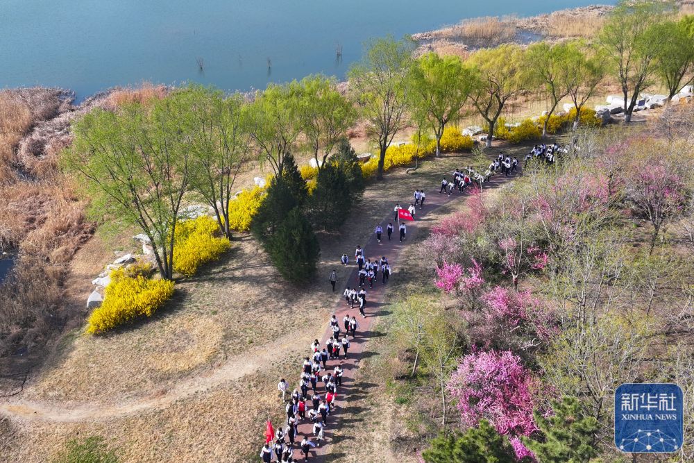 ↑ 4月3日,山東省高密市第五中學的中學生在膠河國家濕地公園參加踏青遠足活動(無人機照片)。新華社發(李海濤攝)