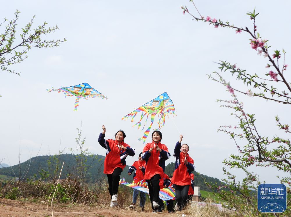 ↑ 4月3日,四川省達州市渠縣新市鎮第一小學學生在陽光大課間放風箏。新華社發(鄧良奎攝)