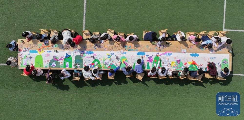↑ 4月3日,山東省鄒平市高新街道中心幼兒園的小朋友在繪制清明長卷(無人機照片)。新華社發(董乃德攝)