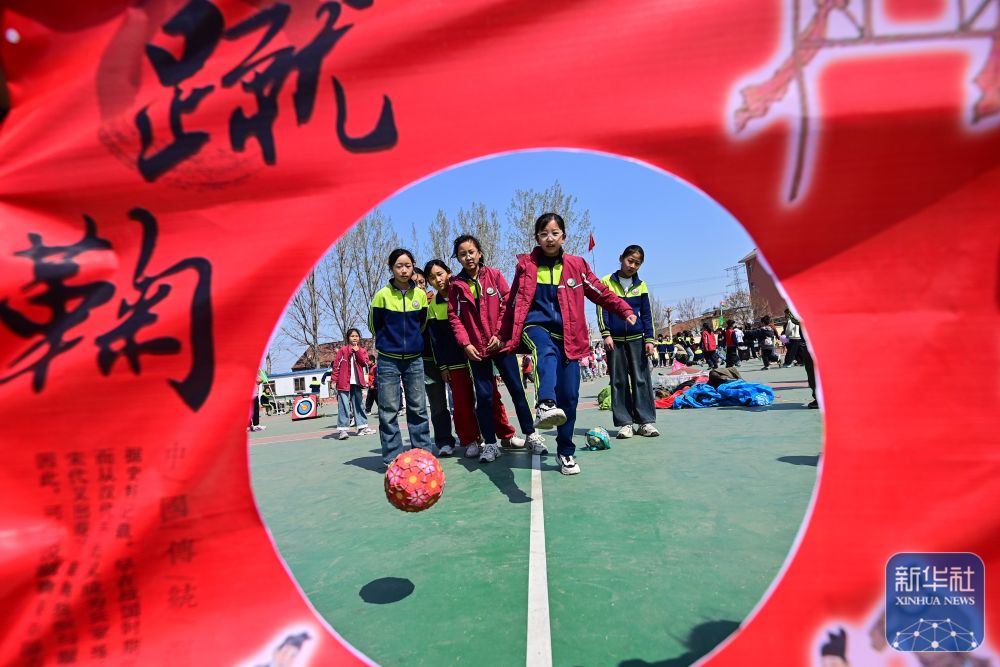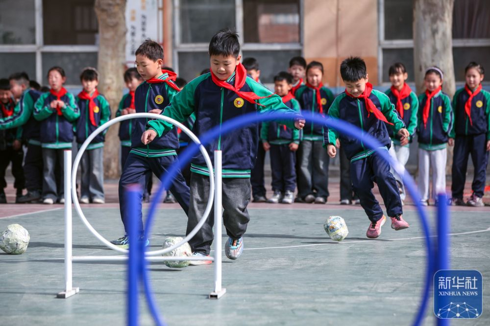 ↑ 4月3日,在河南省焦作市博愛縣清化鎮街道七街小學,學生們在體驗蹴鞠。新華社發(程全攝)