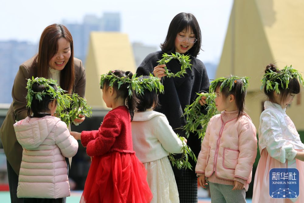↑ 4月2日,在山東省青島市李滄區青峰路幼兒園開展的迎清明活動中,老師指導小朋友編柳帽。新華社發(張鷹攝)