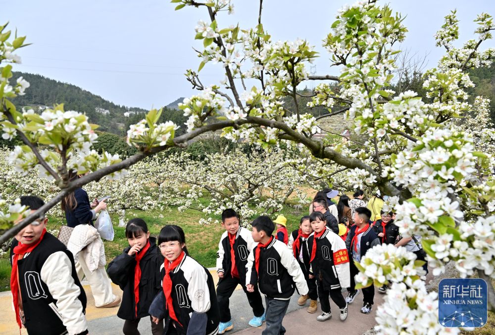 ↑ 4月2日,湖北省宣恩縣清江外國語學校的師生在黃坪村的梨園里徒步。新華社發(宋文攝)