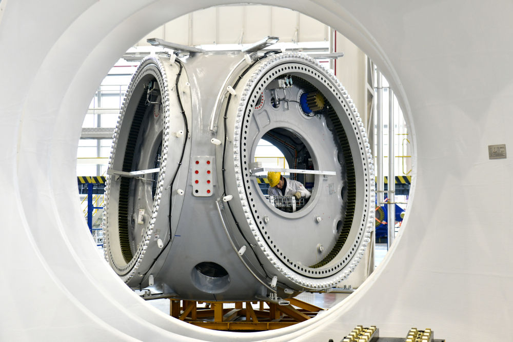 2月22日,在三一重能(日照)風(fēng)電設(shè)備制造有限公司,工作人員在風(fēng)電設(shè)備生產(chǎn)車間忙碌。新華社記者郭緒雷攝
