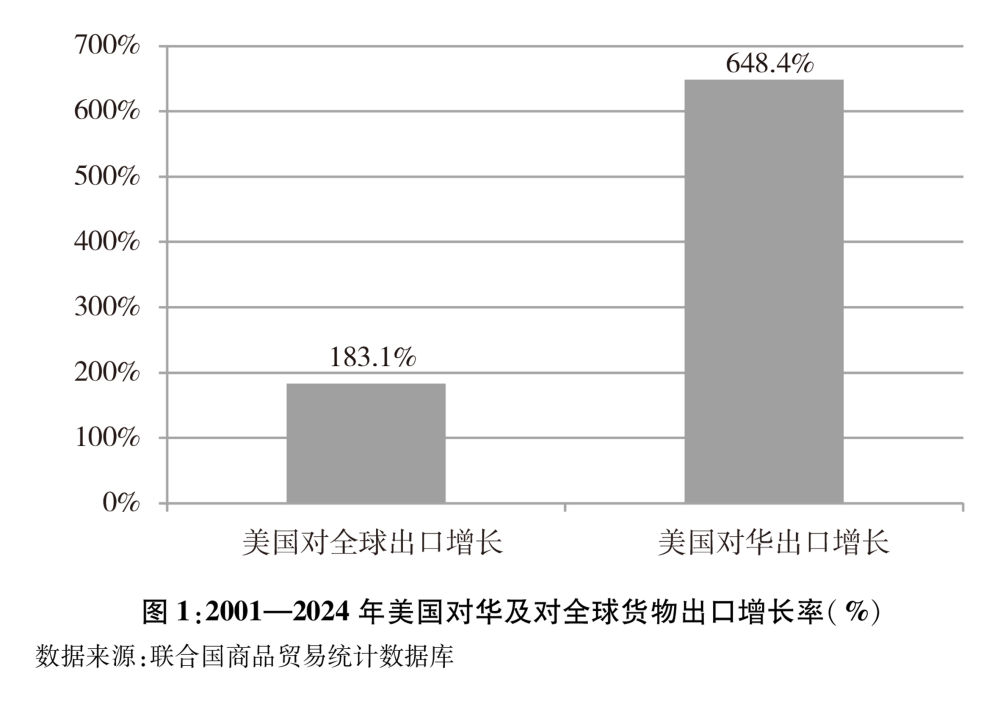 美國對華出口增速明顯快于其對全球出口。中國加入世界貿(mào)易組織以來,美國對華出口快速增長,中國成為美國重要的出口市場。根據(jù)聯(lián)合國統(tǒng)計數(shù)據(jù),2024年美國對華貨物出口額1435.5億美元,較2001年的191.8億美元增長648.4%,遠遠高于同期美國對全球183.1%的出口增幅(圖1)。