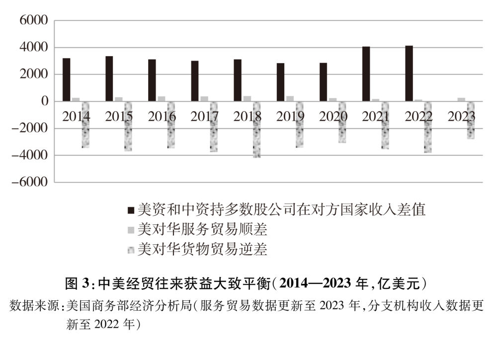 根據(jù)美國商務(wù)部數(shù)據(jù),2023年美國對華服務(wù)貿(mào)易順差為265.7億美元,美國在服務(wù)貿(mào)易方面占有顯著優(yōu)勢;2022年美資企業(yè)在華銷售額高達4905.2億美元,遠高于中資企業(yè)在美786.4億美元的銷售額,差額高達4118.8億美元,美國企業(yè)跨國經(jīng)營優(yōu)勢更為突出。