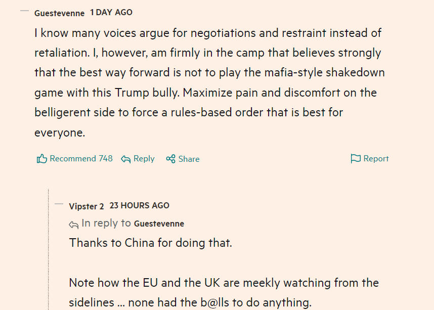 中國的嚴正立場也引發了同樣受到美國關稅影響的各國網民對中國的廣泛支持。在英國《金融時報》相關報道評論區,獲贊最多的一條網友評論稱:“我知道有許多聲音主張通過談判和克制來解決問題,而不是采取反制行動。然而,我強烈認為最好的前進方式就是將好戰一方的痛苦和不適最大化,如此才能建立一個對所有人都有利的基于規則的秩序。”