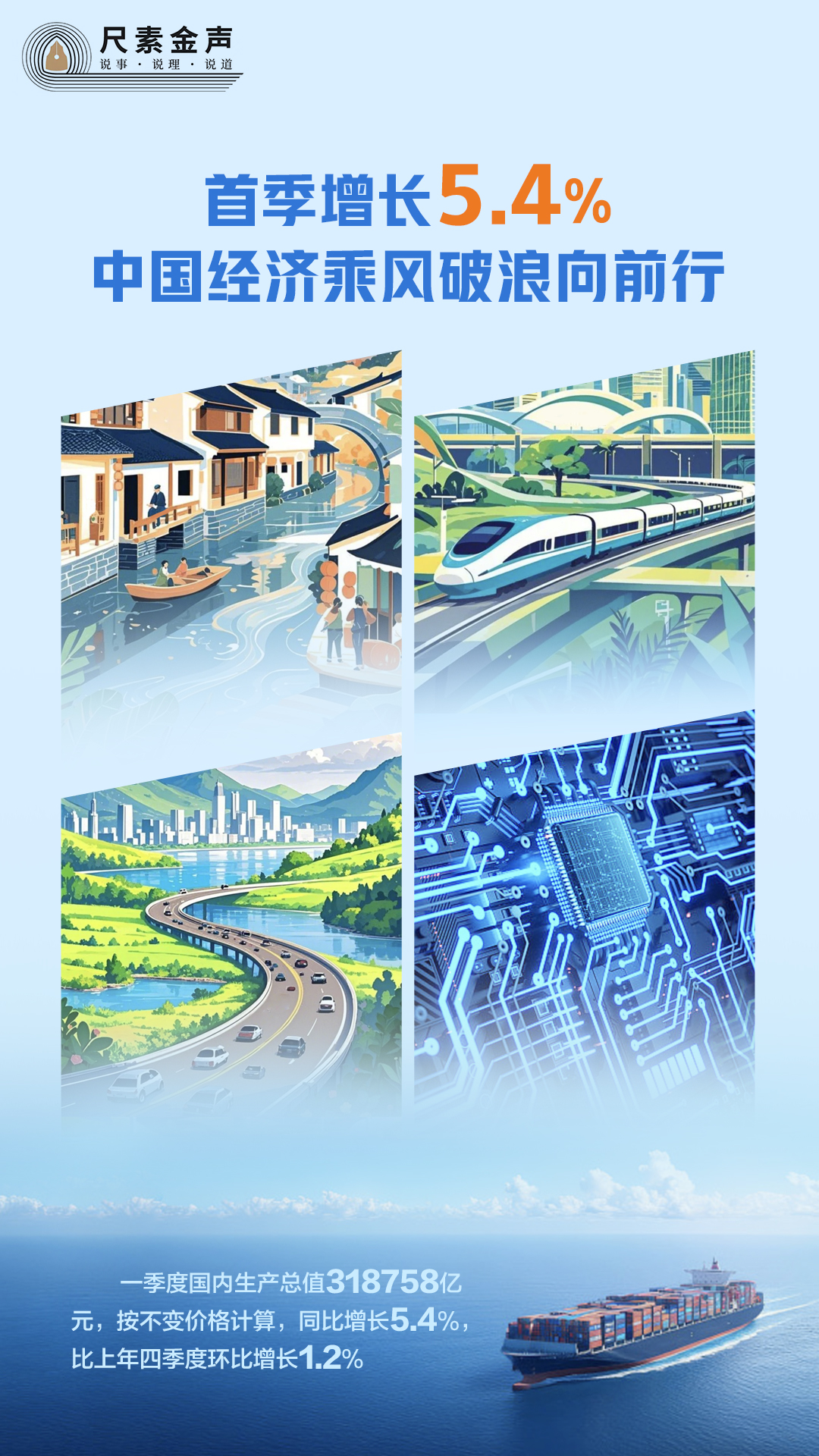初步核算,一季度國內生產總值318758億元,按不變價格計算,同比增長5.4%,比上年四季度環比增長1.2%。