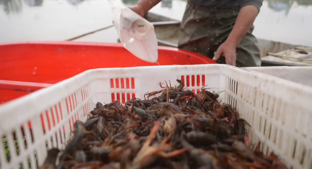 剛出水的小龍蝦被立即送往分揀中心,進行質量檢驗和稱重分級。分揀線上,分揀工岳臘春戴著橡膠手套,指尖翻飛間完成了龍蝦的分級。岳臘春說,“我們是發月工資,一個月5000元,一天工作按貨的多少來定。”