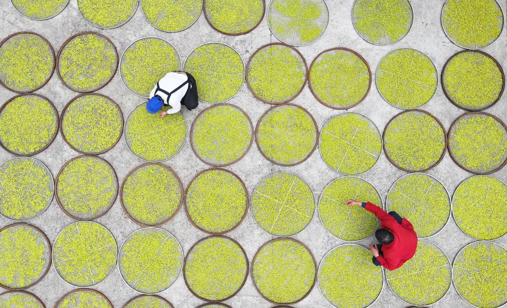 4月7日,在湖南省永州市雙牌縣上梧江瑤族鄉盤家村云臺山生態有機茶園,茶農在攤曬春茶(無人機照片)。新華社發(何紅福攝)