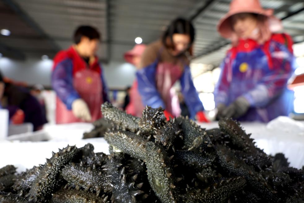 4月14日,在霞浦縣溪南鎮一家水產養殖企業,工人在分揀、包裝海參。新華社發(王旺旺 攝)