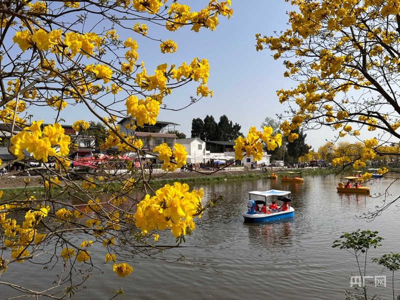 四月芳菲盛,踏青正當時。近日,四川省簡陽市東麓花溪的千畝黃花風鈴木迎來盛花期,金黃花海不僅吸引八方游客紛至沓來,更催生出多元消費新場景,讓“鮮花經濟”綻放出獨特魅力。