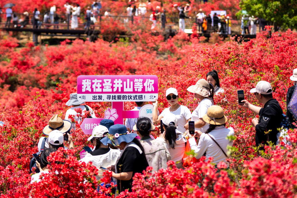2025年4月16日,游客在浙江省瑞安市馬嶼鎮圣井山杜鵑花海賞花。新華社發(孫凜攝)