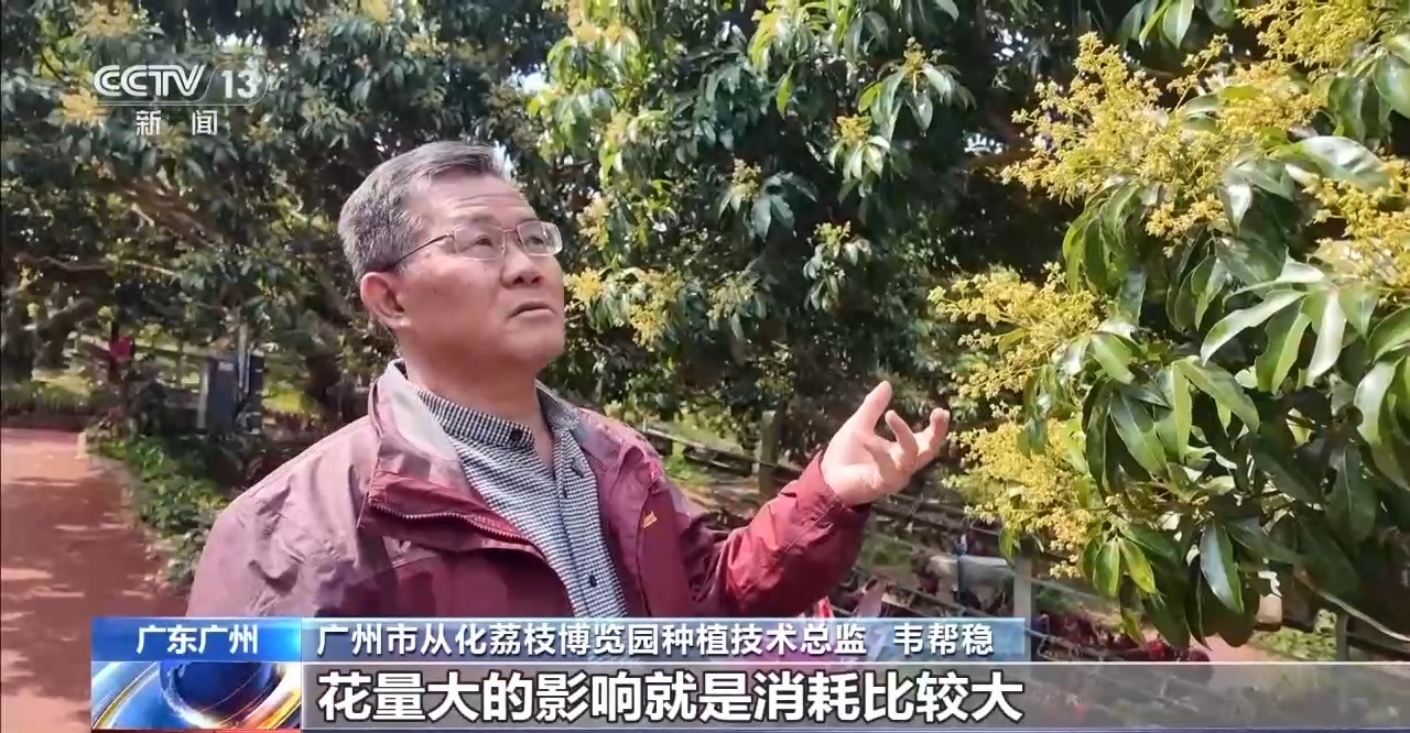 廣州市從化荔枝博覽園種植技術總監 韋幫穩:今年花量比較大,花量大的話消耗比較大,所以我們說我們利用飛鳥給我們預警,就會告訴我們多少花量比較合適。既能達到豐產,又能達到優質。