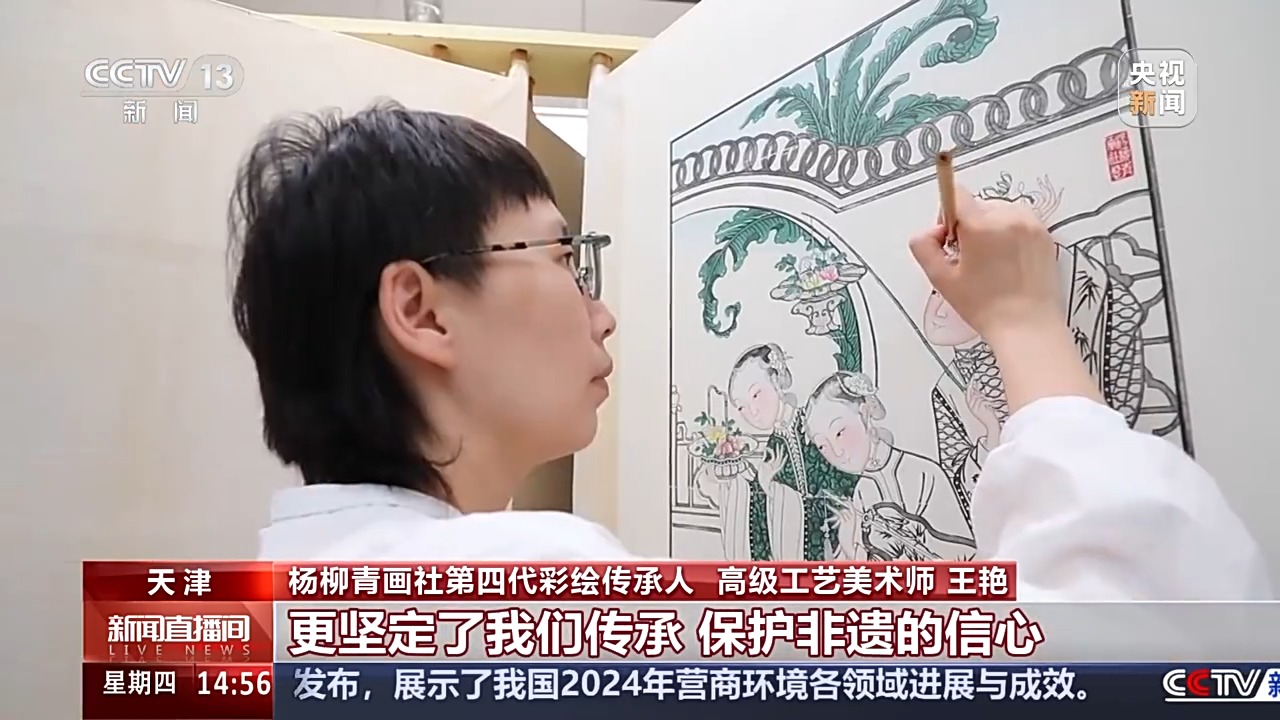 楊柳青畫社第四代彩繪傳承人、高級工藝美術師 王艷:人們的喜愛,讓我收獲了更多的文化認同感,更堅定了我們傳承、保護非遺的信心,希望我們可以創作出更多具有這個時代屬性的新年畫。
