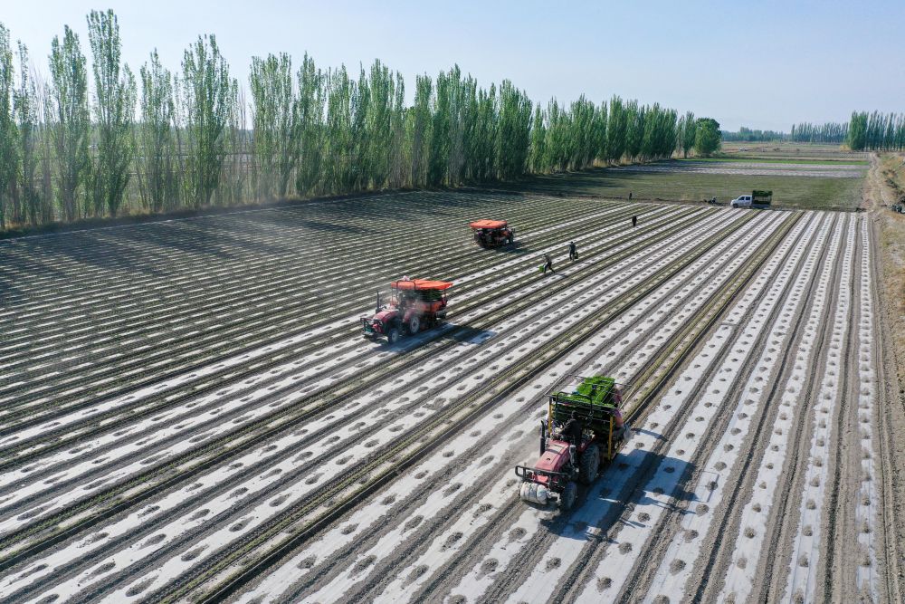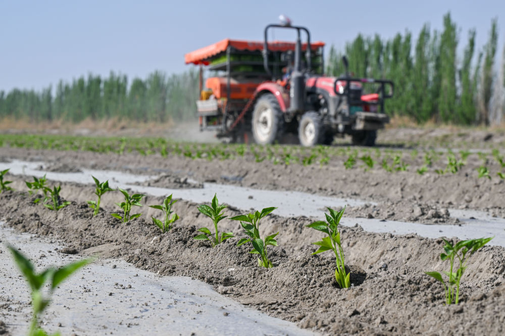 在新疆巴音郭楞蒙古自治州博湖縣本布圖鎮,農戶操作移栽機在農田里移栽辣椒苗(4月29日攝)。新華社記者丁磊 攝
