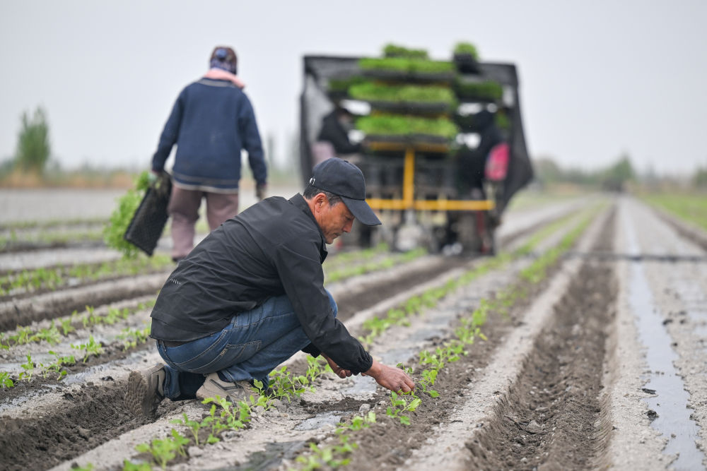在新疆巴音郭楞蒙古自治州焉耆回族自治縣四十里城子鎮,農戶檢查栽苗效果(4月26日攝)。新華社記者丁磊 攝