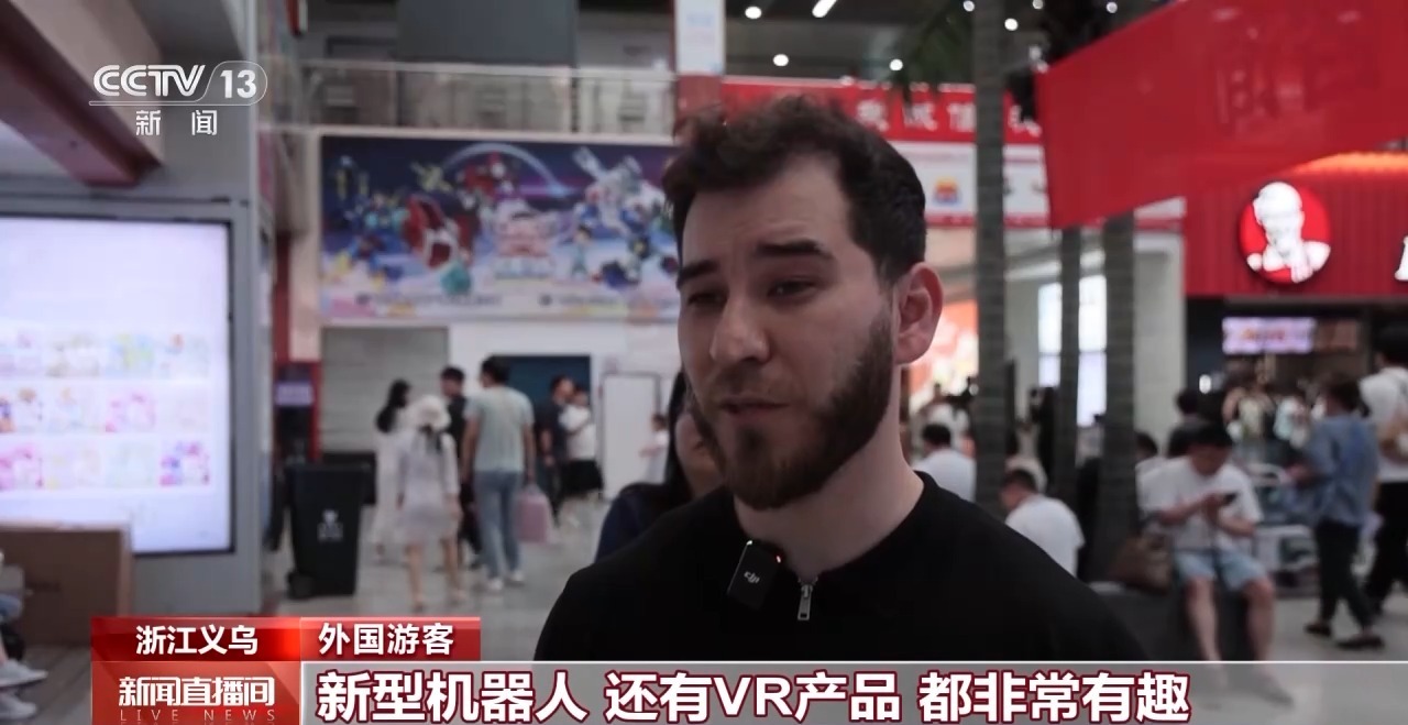 外國游客:我的朋友們是第一次來義烏,他們都很喜歡義烏,因為這里的產品都很有意思,吃住也都很舒適。我們剛剛在體驗AR產品、新型機器人、VR產品,都非常有趣。