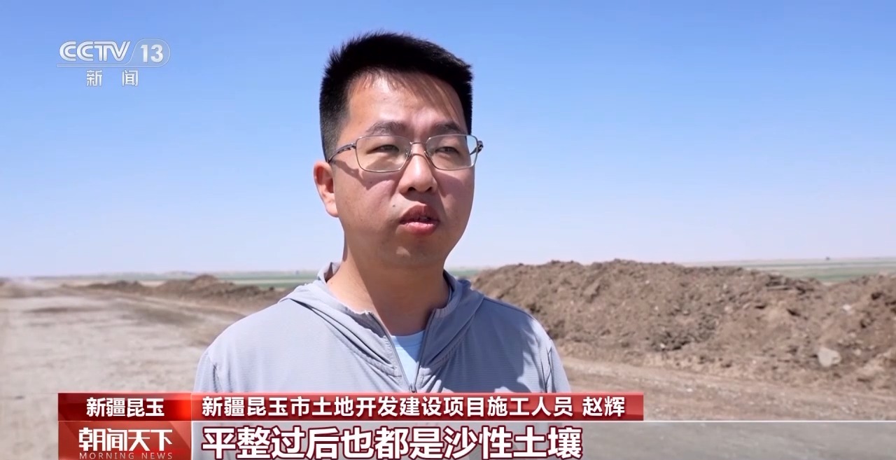 新疆昆玉市土地開發建設項目施工員 趙輝:這邊原本都是沙漠原始地貌,平整過后也都是沙性土壤,沙土的營養貧瘠,肥力差,抓一把土,能從指縫里漏掉90%。通過羊糞和水溶肥的有效結合,施進去之后,我們能把沙土的結構團?;?,簡單來說就是把一團散沙變成緊密有孔隙的小團體,這樣施進去的水和營養都能留存住。