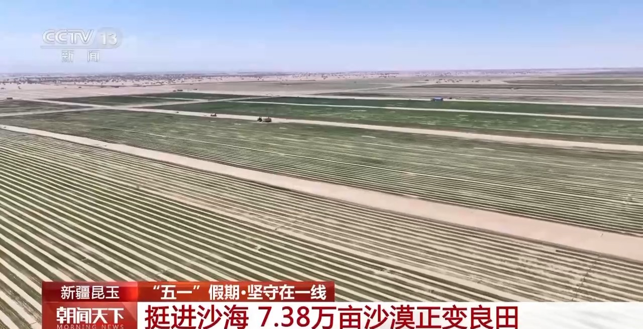 當大多數人享受悠閑的假期時,鏖戰在沙海深處的勞動者沒有停歇。在位于塔克拉瑪干沙漠南緣的新疆昆玉市,7.38萬畝土地開發建設項目進入攻堅階段,上百臺裝載機、平地機來回穿梭進行平沙作業。