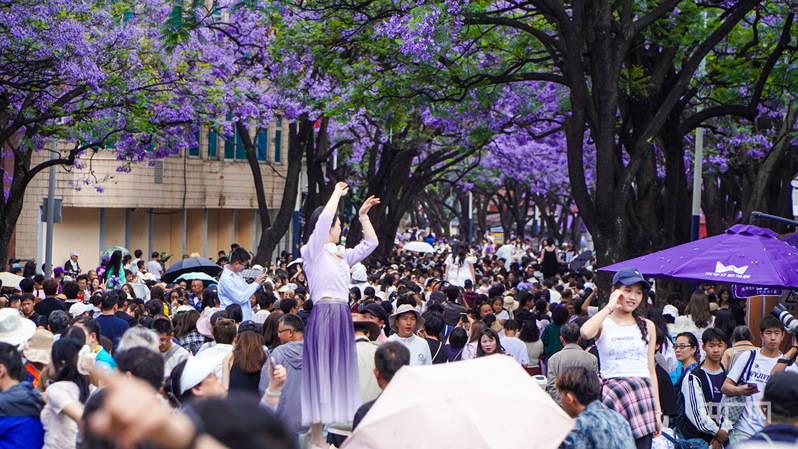 “五一”假期,前來昆明教場中路觀賞藍花楹的游客絡繹不絕(央廣網記者 魏文青 攝)