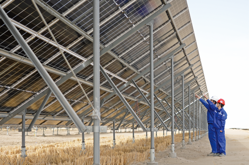 在塔克拉瑪干沙漠北緣,中電建阿克蘇地區沙雅縣25萬千瓦光伏產業園區,一個個光伏板被“種植”在沙漠中,通過吸收陽光轉化為清潔電能。光伏板下,由蘆葦稈扎成的草方格如同棋盤鋪向遠方,每個1米×1米的方格內,嫩綠的梭梭苗正破土而出。