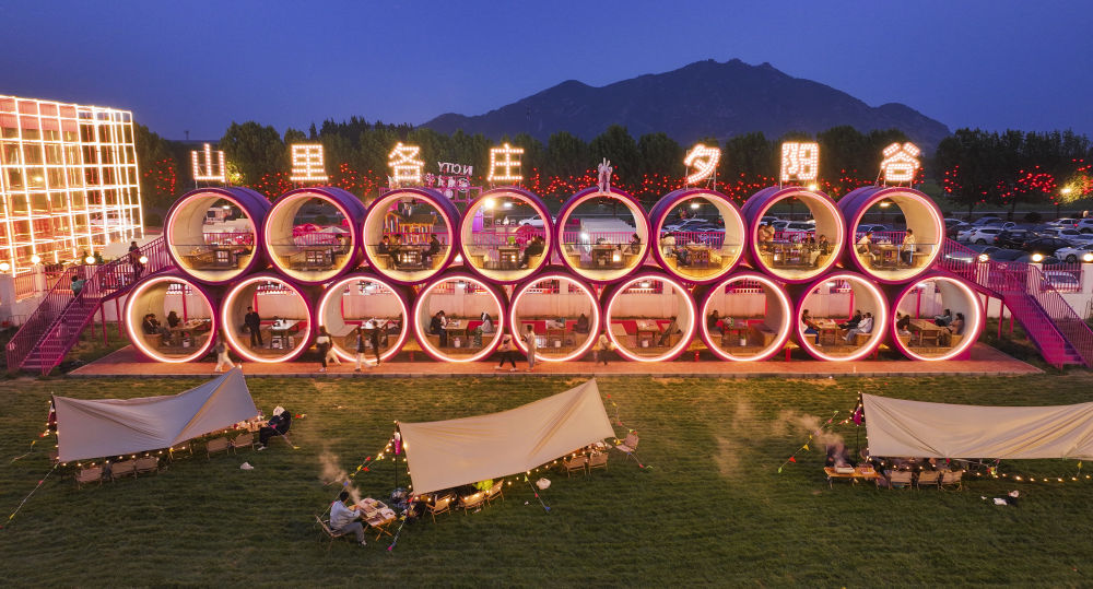 5月5日,游客在河北省遵化市夕陽谷景區游玩時品嘗美食(無人機照片)。