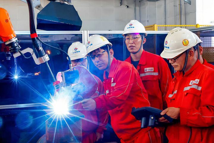 2025年4月29日,在海油工程天津智能化制造基地,劉海林(左二)和同事調(diào)試一臺(tái)焊接機(jī)器人。