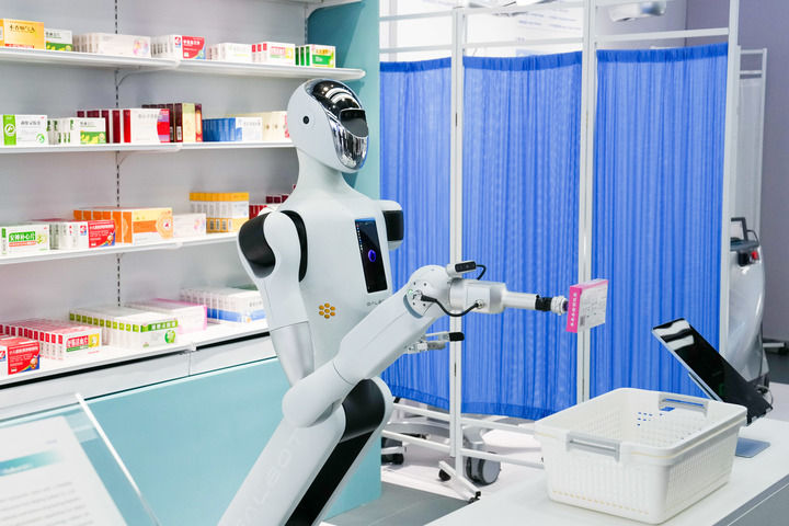2025年2月24日,在北京“機(jī)器人大世界”的應(yīng)用場(chǎng)景示范區(qū),銀河通用機(jī)器人進(jìn)行藥店無人值守場(chǎng)景演示。