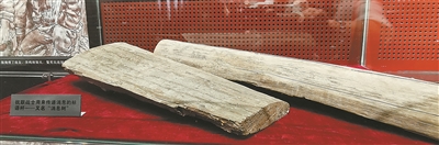 展柜中看似普通的兩塊木頭,實(shí)為文物“消息樹”。樹皮上,“中國報”等字跡仍能辨認(rèn)。
