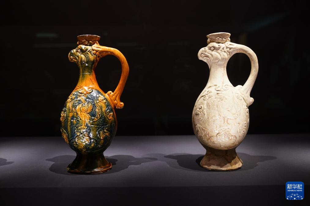 繼續前行,便來到“跨越文化——胡食風尚”單元。故宮博物院藏唐代鳳首壺與舊金山亞洲藝術博物館藏鳳首壺“并肩而立”,它們獨特的把手與流口設計,仿佛訴說著胡人傾注式倒酒習俗對中原的影響。