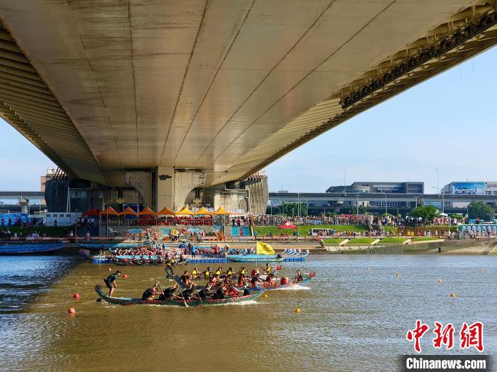 5月30日,臺灣迎來端午節連假,全臺多地舉行龍舟比賽等活動。圖為臺北大佳河濱公園,2025臺北國際龍舟錦標賽首日比賽正在進行。中新社記者 張曉曦 攝
