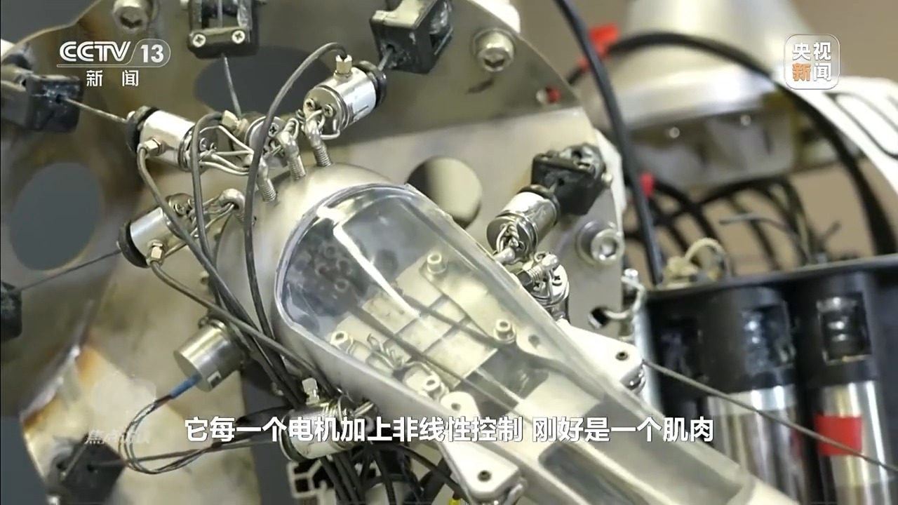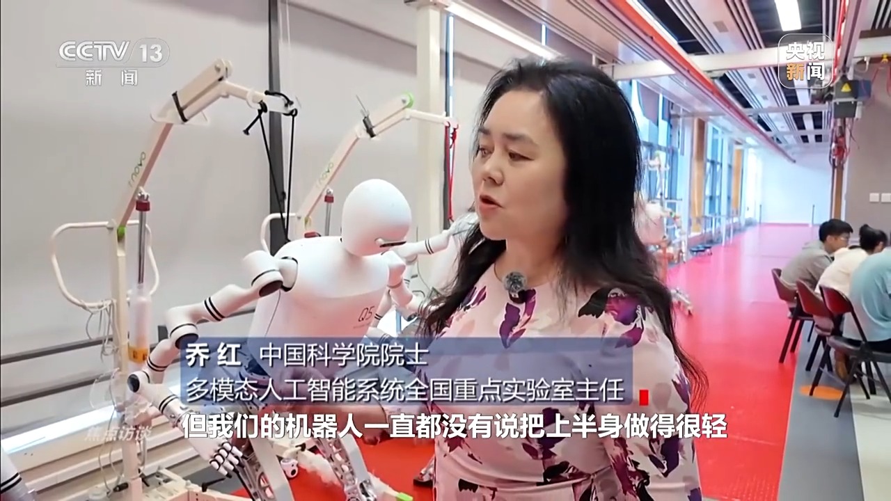 中國科學院院士、多模態人工智能系統全國重點實驗室主任 喬紅:人形機器人都是自由度(關節)比較多,但我們的機器人一直都沒有把上半身做得很輕,因為它是要作業的、干活的,所以沒有專門追逐要跑得快,跑得快也是我們的期望,現在也能跑2.2米每秒。