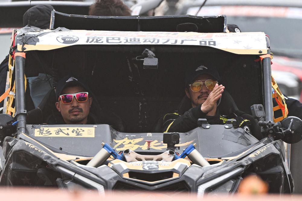 ↑6月1日,駕長車隊車手吳京(右)、領航員梁冬冬在賽后參加收車儀式。新華社記者 辛悅衛 攝