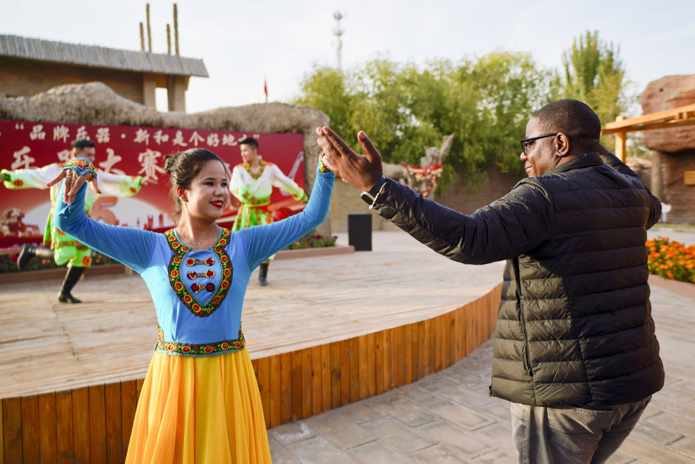 ↑2024年10月15日,第六屆世界媒體峰會與會嘉賓在阿克蘇地區新和縣加依村龜茲文化樂器展示中心與演員互動。新華社記者 陳朔 攝
