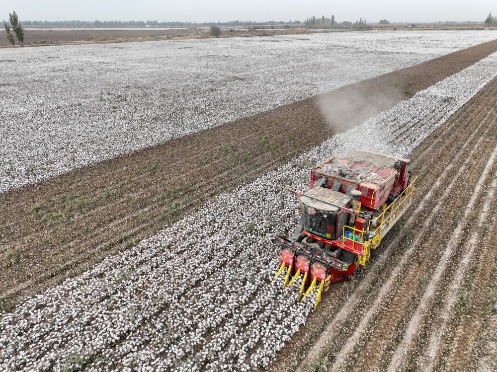 ↑2024年10月24日,在新疆阿克蘇地區阿瓦提縣,一臺大型采棉機在棉田里作業(無人機拍攝)。新華社記者 高晗 攝