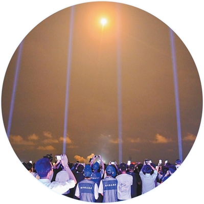 “5,4,3,2,1”——火箭的火焰照亮夜幕,平臺的光束射向天際……19時50分,火箭發射升空,游客們舉著手機記錄,現場歡呼聲陣陣。“很興奮、很震撼,感覺一伸手就能‘抓’到火箭。”延鈺菲說。