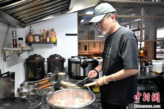 圖為陳駿凱正在店內廚房制作菜品。中新網記者 呂明 攝