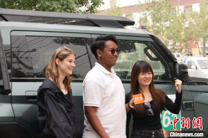 北京語言大學的留學生們在環塔拉力賽事期間體驗中國新能源車。賈志鵬 攝