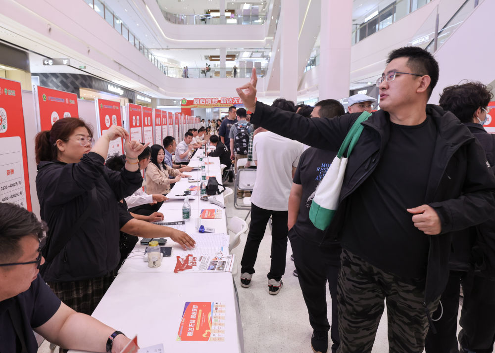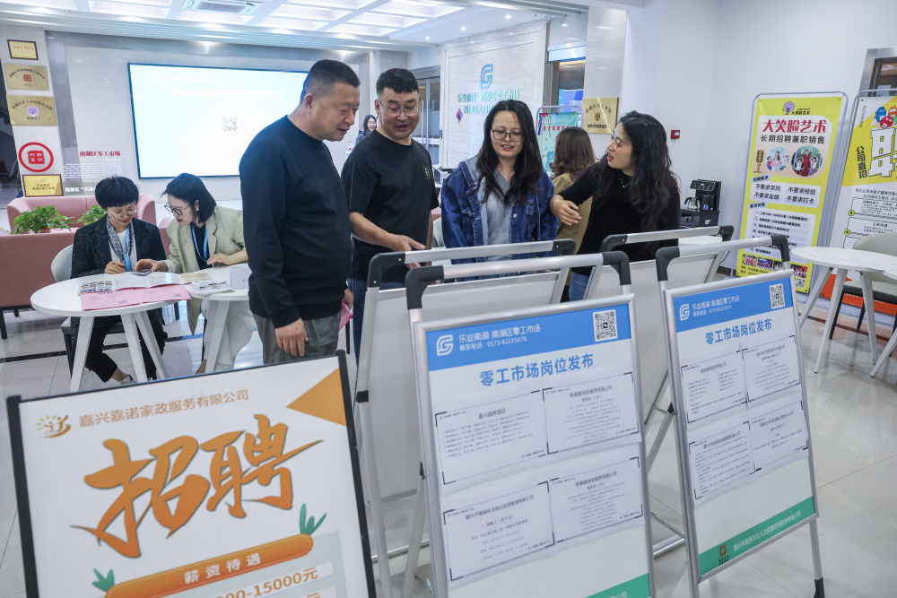 5月8日,在浙江省嘉興市南湖區零工市場的一場零工招聘會上,求職者查看各類崗位。新華社記者 徐昱 攝