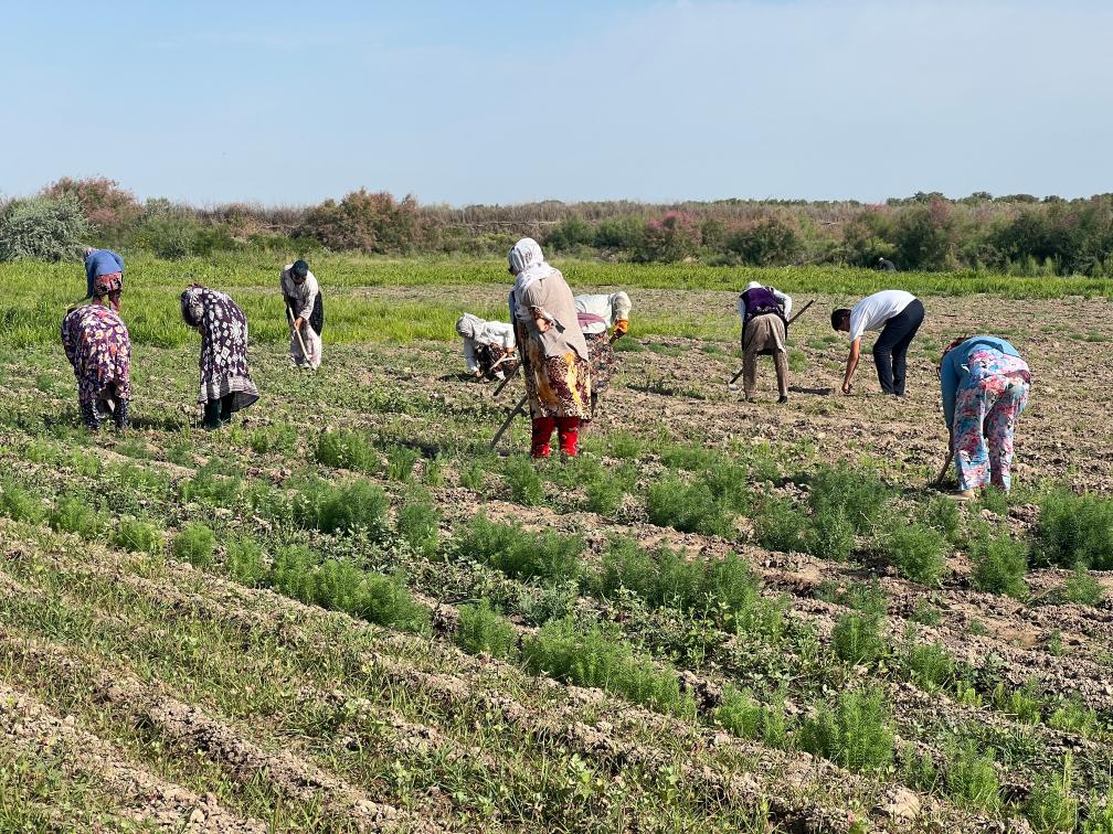 6月3日,位于烏茲別克斯坦穆伊納克鎮的咸海國際創新中心的試驗示范園區內,當地農戶在與中國科學院新疆生態與地理研究所合作共建的“光伏+生態”鹽生植物園里勞作。(受訪者供圖)