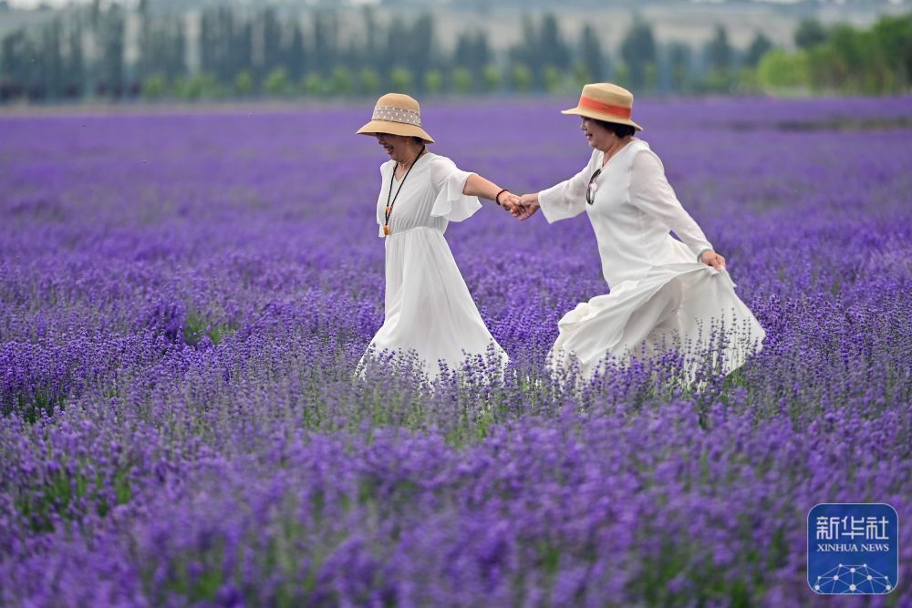 游客在新疆伊犁哈薩克自治州霍城縣解憂公主薰衣草農場游玩(6月14日攝)。