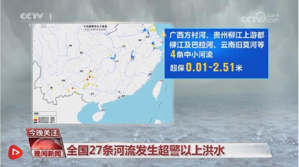 水利部消息,6月21日8時至22日8時,受降雨影響,廣西柳江干流及支流方村河、貴州沅江支流巴拉河、云南右江支流舊莫河及瀾滄江支流勐統河等27條河流發生超警以上洪水,最大超警幅度3.71米,其中廣西方村河、貴州柳江上游都柳江及巴拉河、云南舊莫河等4條中小河流超保0.01~2.51米,云南勐統河發生1979年以來最大洪水。此外,江蘇里下河地區新增8站水位超警0.02~0.51米。