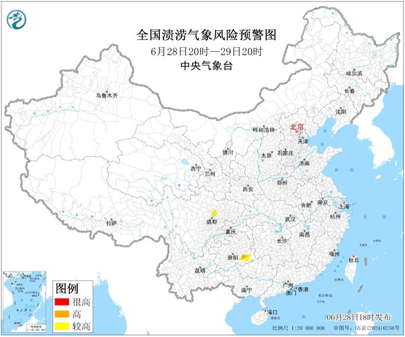 受強降雨的影響,預計6月28日20時至29日20時,廣西北部、貴州東南部、四川中北部等地部分地區發生漬澇的氣象風險較高,其中,貴州東南部局地發生漬澇的氣象風險高,易形成城市內澇和農田漬害,需加強防范。