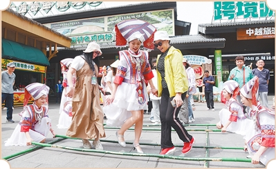游客在中越德天(板約)瀑布跨境旅游合作區體驗民俗。