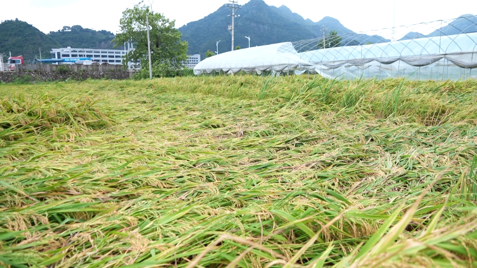 農技專家楊煥清來到現場指導農戶搶收,“它倒平后很容易會發芽,稻谷發芽以后就沒有價值了。現在主要就是開溝排水,一有晴天馬上搶收。”