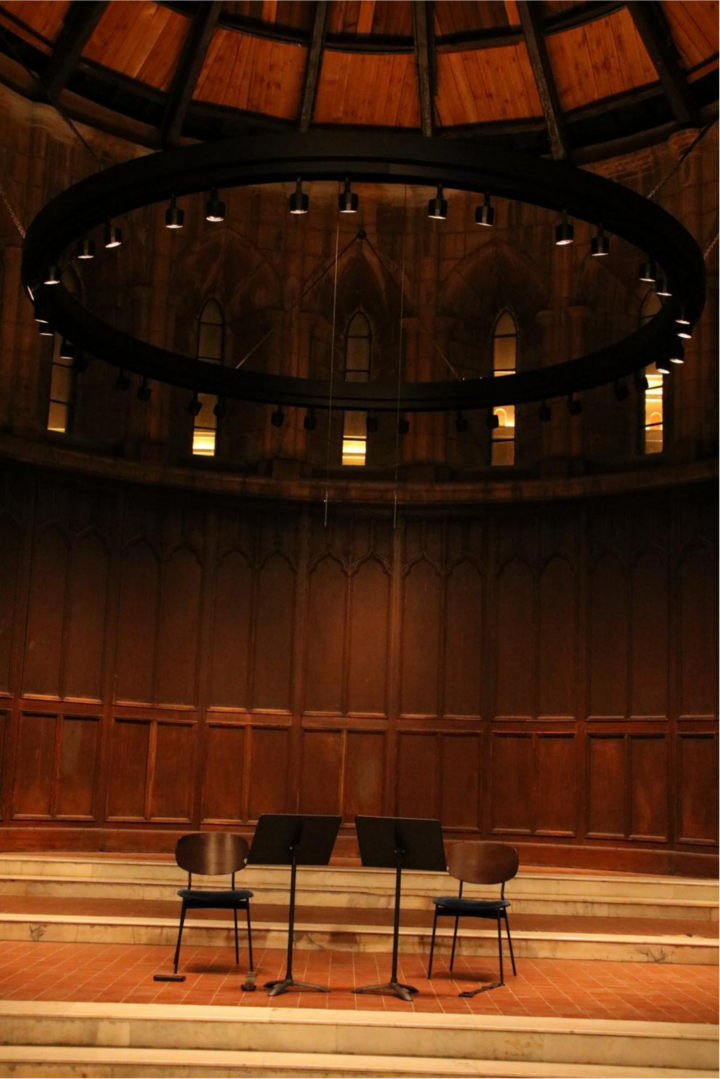 第二天晚上,我又來到安里甘藝術中心,觀看天津音樂學院師生演奏的“仲夏弦音:大提琴的沉吟與重奏”音樂會。坐在安里甘主堂倒沙漏形的穹頂下,沐浴在大提琴深情莊嚴的奏鳴中,我沉醉了。