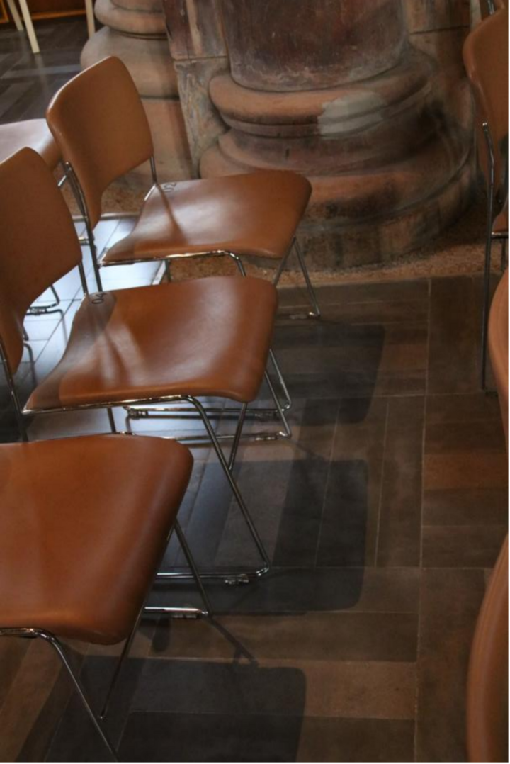 在原來祭臺的中間,現在改造為演講、演奏的環形中心臺。上方是一個中央環形燈,在沒亮燈之前就像一條烏黑色的緞帶,神秘且漂亮。